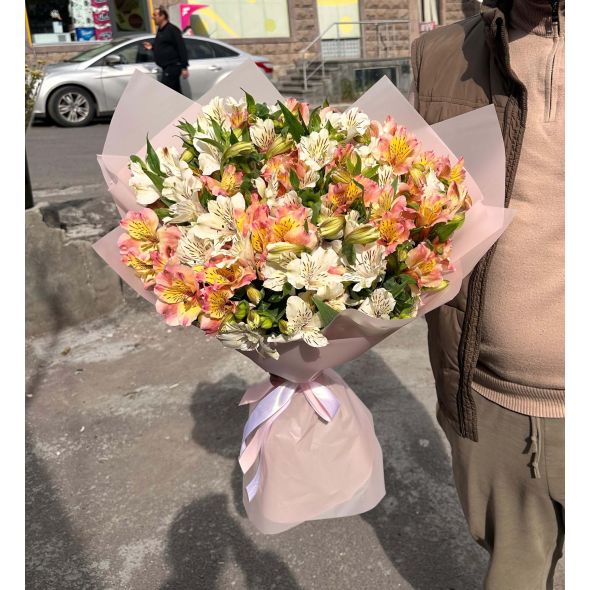 A fragrant bouquet of delicate freesia, spray roses and eucalyptus branches