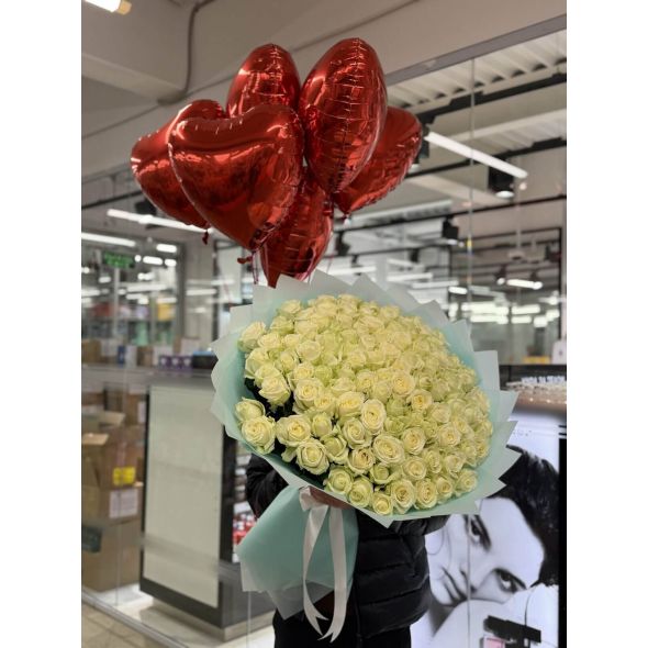 Белые розы 19 шт 60 см в сиреневой упаковке
